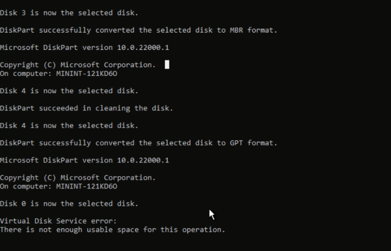 command. If it shows “There is not enough usable space for this operation,” you need to increase the disk capacity of the target WinPE boot host, ideally by 10–15GB more than the original machine, to ensure the recovery process completes successfully.