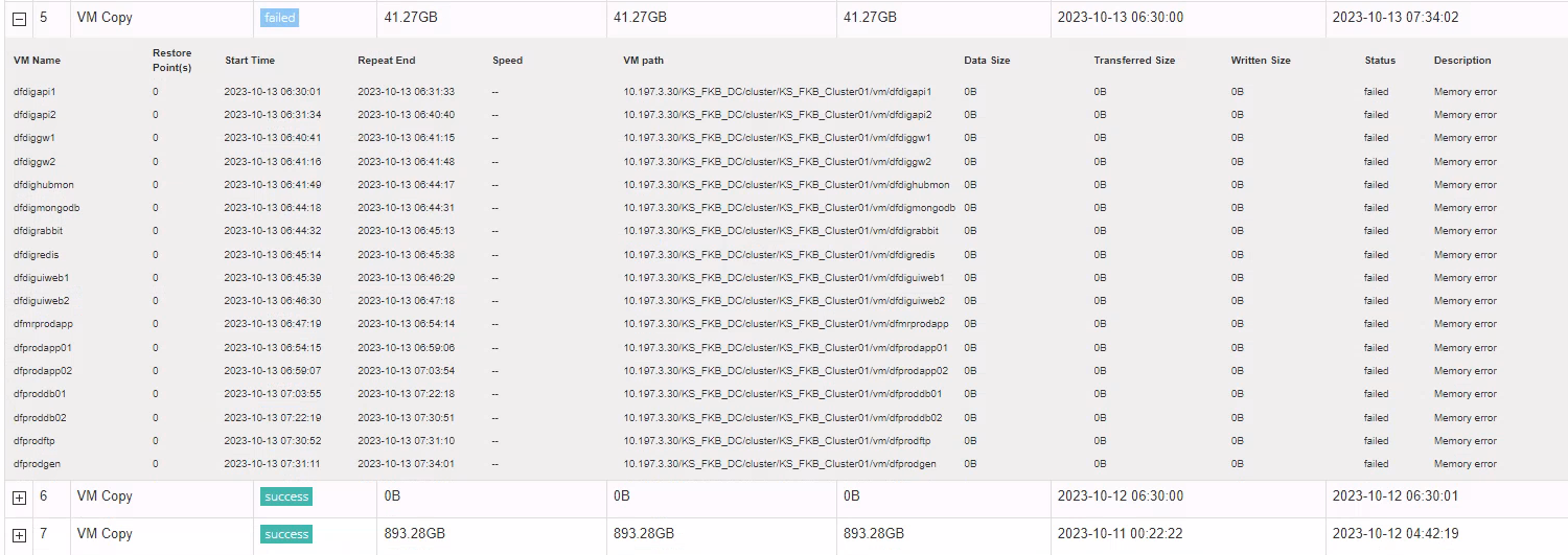 During cross-site DR replica synchronization, the task fails consistently. The backup management page displays a "Memory Error". The attached screenshot shows the detailed log.