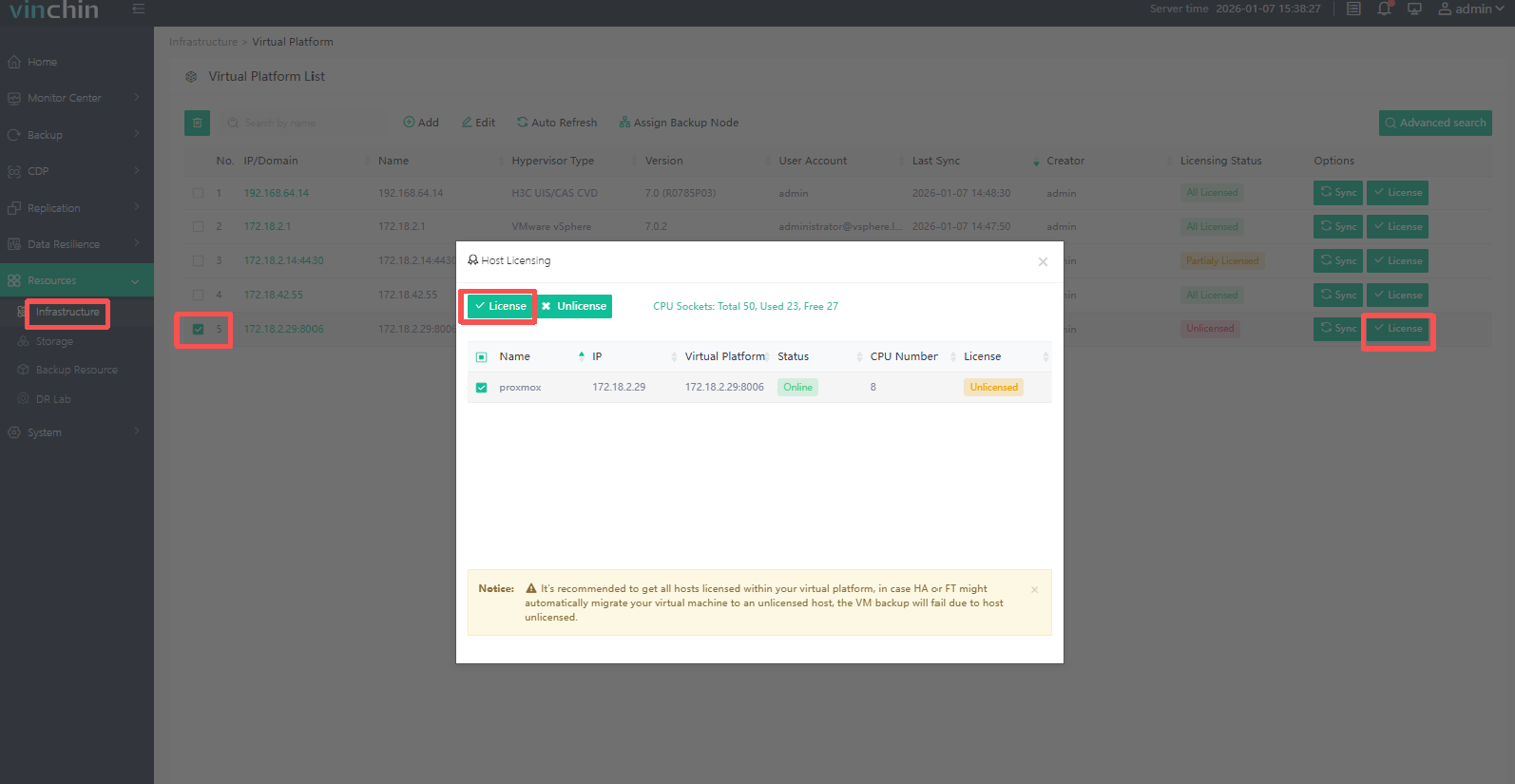 In the Infrastructure section,select Authorize/license to re-authorize the virtualization platform host.