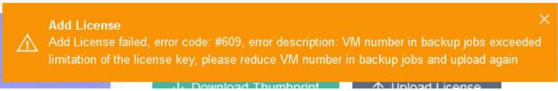 Add License failed, error code: #609, error description: VM number in backup jobs exceeded limitation of the license key, please reduce VM number in backup jobs and upload again