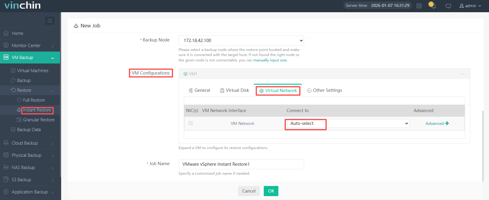2.If the virtualization environment has multiple network adapters configured and the default selection is ineffective, manually select the network adapter for restoration.